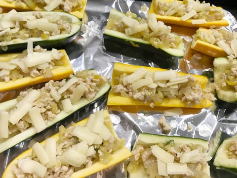 - 4をズッキーニに戻し、とろけるチーズをふりかける。